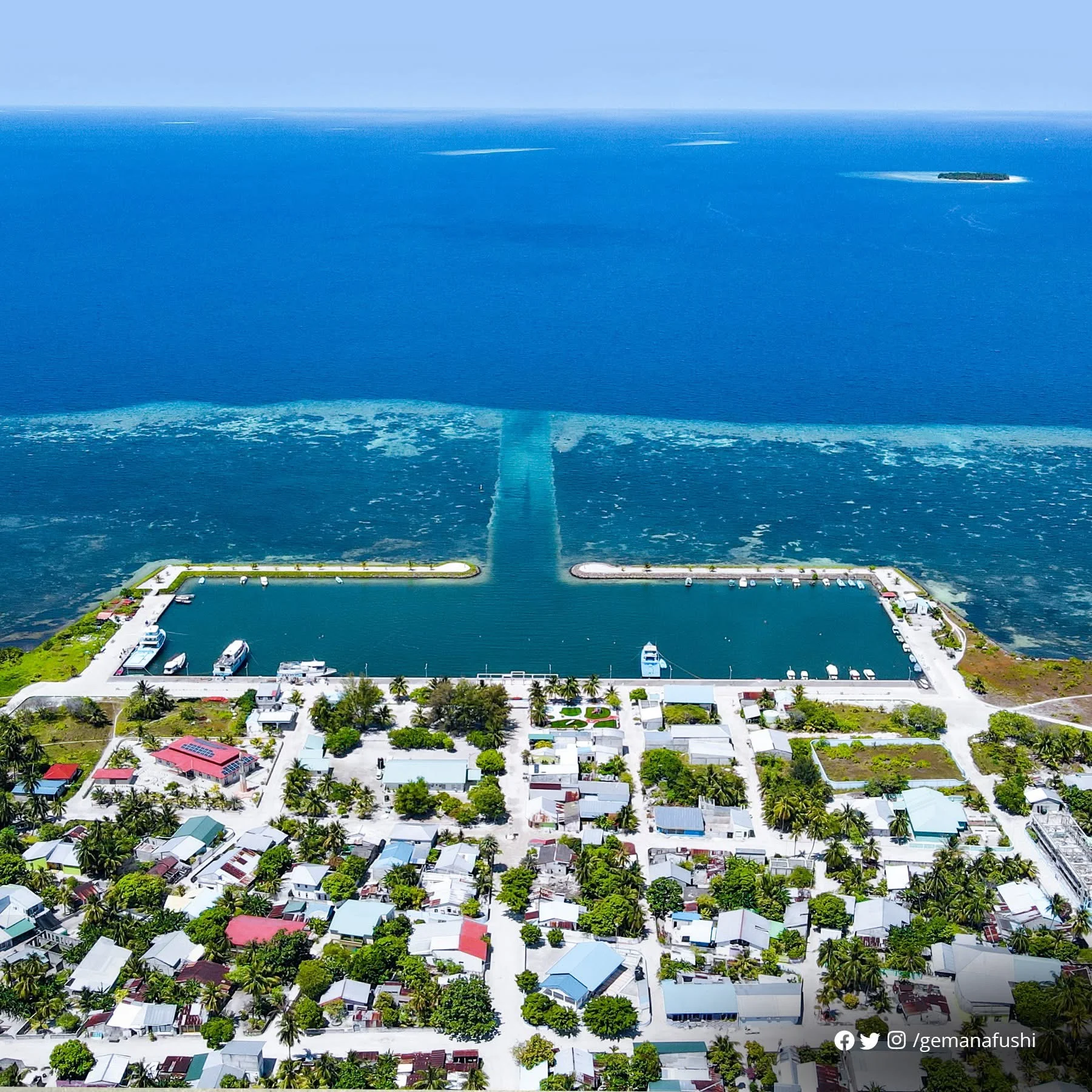 Gemanafushi Harbor Welcome Home is a charming and inviting coastal pavilion located on the serene island of Gemanafushi in the Maldives. This harborfront structure greets visitors with a modern, open-air design framed by elegant white pillars and a ribbed roof design reminiscent of coral or marine life—a subtle nod to the island’s deep connection with the ocean. Surrounded by swaying palm trees and lush greenery, the structure is accented with golden details, creating a warm, festive atmosphere. The hashtag #VisitGemanafushi painted prominently on the front wall serves as both a local pride statement and a friendly invitation to explore the natural beauty and hospitality of this lesser-known Maldivian gem. Nestled along the clear turquoise waters, this welcome center embodies the peaceful and tropical charm of the island, making it an ideal first impression for travelers arriving by boat. Whether you’re visiting for relaxation, adventure, or cultural exploration, Gemanafushi Harbor sets the tone for a memorable experience.